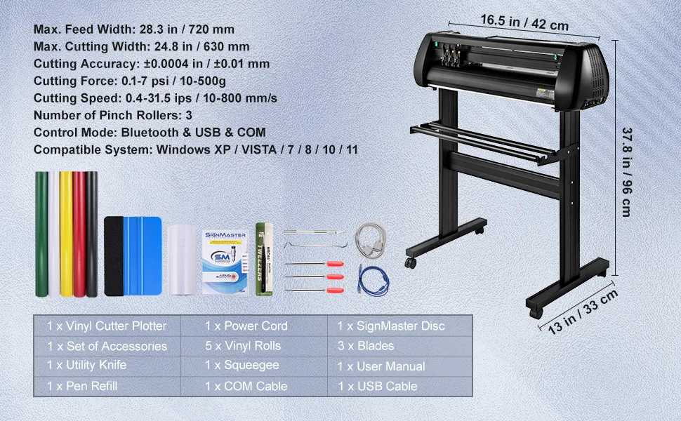 Három ±0,004 hüvelykes, cserélhető vinilvágó penge található a készülékben a különböző vastagságú anyagok nagy pontosságú vágásához. Három állítható, dupla rugós szorítógörgő és alumínium recézett rudak biztosítják, hogy a vinilplotter egyenletesen adagolja a papírt papírelakadás nélkül, így könnyedén életre keltheti terveit a vinileken.