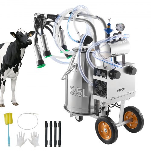 VEVOR elektromos tehénfejőgép, 25 literes 304 rozsdamentes acél vödör, élelmiszeripari minőségű fejőcsészék és szilikon tömlő, erős szívóerő, vákuumpulzáció, elektromos fejőgép kerekekkel tehenekhez