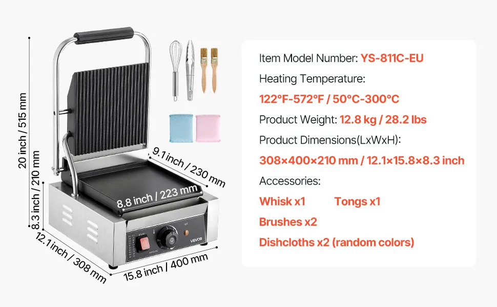 • Könnyen tisztítható: Ez a panini szendvicssütő kivehető olajtálcával rendelkezik, hogy könnyen összegyűjtse a fáradt olajat és a maradványokat. A karbantartás egyszerű egy kaparó és egy száraz ruhával. Mindkét oldalon több szellőzőnyílás található, amelyek hatékonyan elvezetik a hőt, és segítenek fenntartani a gép megfelelő hőmérsékletét.