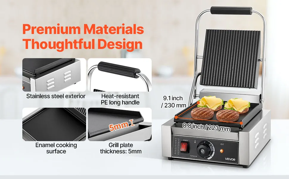 • Tartós és hosszú élettartamú: Ez az ipari paninisütő rozsdamentes acél külső bevonattal és vastagított, zománcozott grillsütő lappal rendelkezik, így rozsdaálló, nedvességálló és hőálló. Tartós tartósságot és teljesítményt nyújt. A meghosszabbított ABS fogantyú hatékonyan megakadályozza az égési sérüléseket, a csúszásmentes lábak pedig további biztonságot nyújtanak.