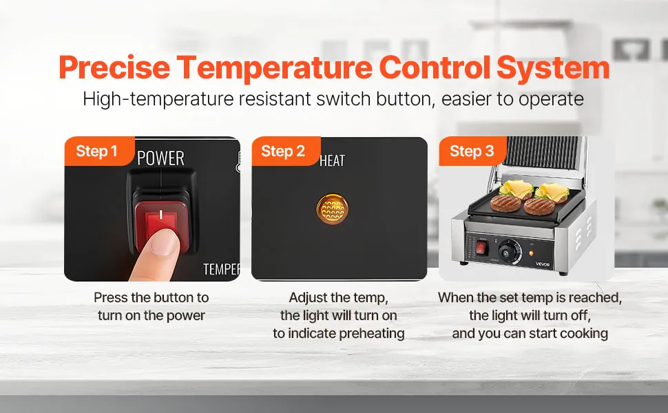 • Precíz hőmérséklet-szabályozás: Az ipari szendvicssütő présgrill magas hőmérsékletnek ellenálló gombokkal van felszerelve a precíz hőmérséklet-szabályozás érdekében, amely 50°C és 300°C (122°F és 572°F) között állítható. Ez lehetővé teszi a grill hőmérsékletének beállítását a különböző ételek elkészítési igényeihez. A LED-es fény jelzi a melegítési állapotot, így a kezelés egyszerű és kényelmes.