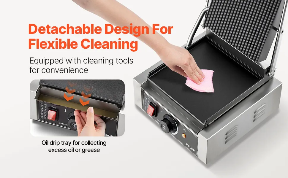 Az elektromos rozsdamentes acél szendvicssütő kivehető tálcával rendelkezik, amely felfogja a főzőlapról leeső zsírt, olajat vagy maradványokat, így könnyen tisztítható.