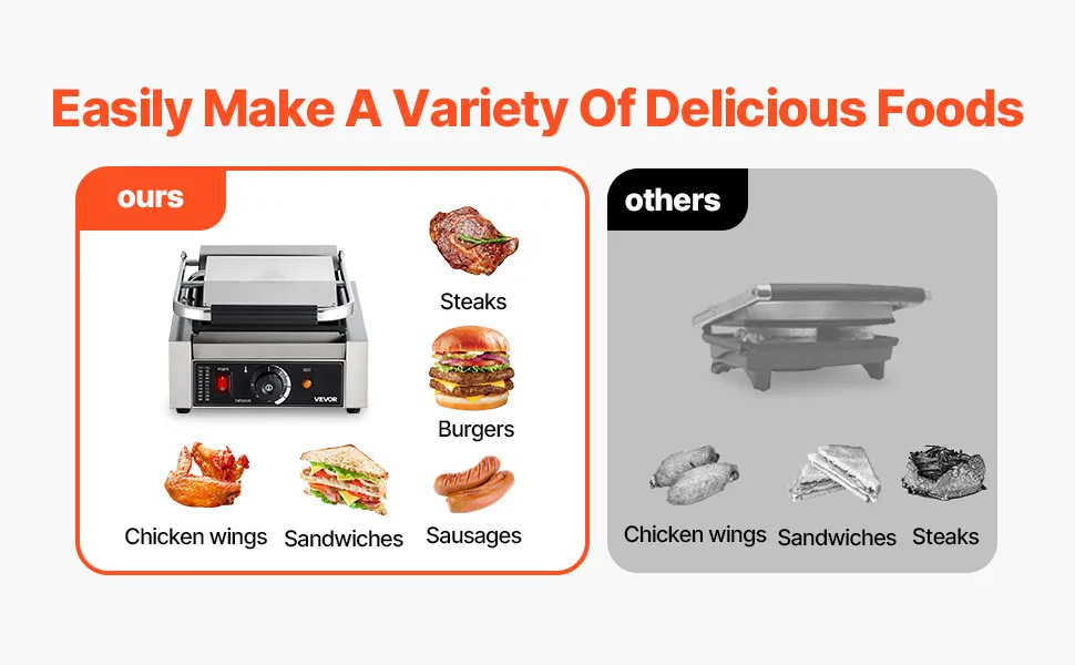 Kereskedelmi paninisütőnk többféle étel elkészítésére alkalmas, így multifunkcionális, így kielégíti a családi összejövetelek, ételárusítóhelyek, éttermek és egyebek iránti igényeket. Sokoldalú főzési élményt nyújt, kompakt grillsütő mérete pedig bőséges főzőfelületet biztosít anélkül, hogy sok helyet foglalna a pulton.