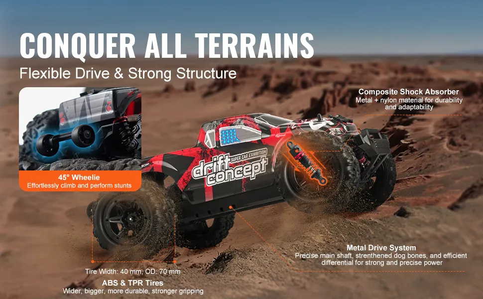 • Kiváló terepjáró képesség: A VEVOR 1:18 távirányítós autó négykerék-meghajtással, masszív fém kardántengellyel, 20 000 fordulat/perc fordulatszámú szupersebességű motorral és nagy tapadású gumiabroncsokkal van felszerelve, így rendkívüli terepjáró képességet mutat, így minden terepen megbirkózik - fűvel, lejtőkkel, kavicsokkal, sárral és homokkal.