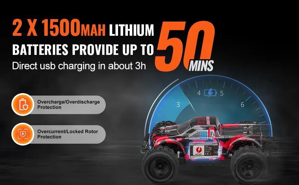 • Kevesebb töltés, hosszabb versenyzési élmény: Két 1500 mAh-s lítium akkumulátorral ez a terepjáró RC teherautó erős és tartós teljesítményt nyújt, így a gyerekek akár 50 percig élvezhetik a versenyzés örömét. A könnyen hozzáférhető USB-portnak köszönhetően, amely különféle tápegységeket (beleértve a külső akkumulátort is) kínál, és a gyorstöltési funkciónak köszönhetően a terepjáró mindössze 3 óra alatt visszatérhet a pályára.