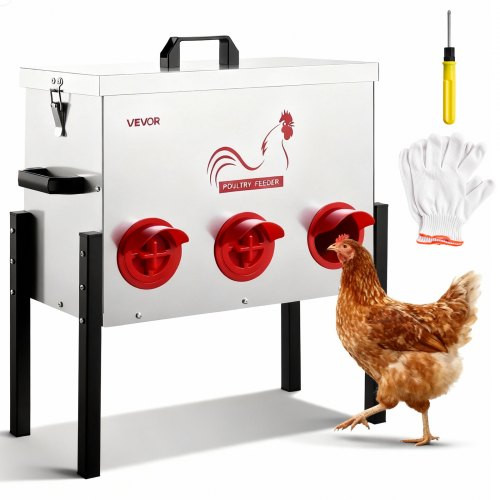 Ez a 13,6 kg-os fém automata csirkeetető hat etetőnyílással rendelkezik, így több baromfi is egyszerre etethető. Gravitációs adagolásának köszönhetően automatikusan utántölti a takarmányt, így takarmányfogyasztást takarít meg.