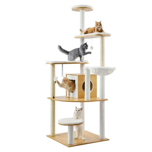 Ez a macskatorony olyan szórakoztató játékokat tartalmaz, mint egy lógó labda és egy ugratópálca, hogy felkeltsd macskád kíváncsiságát és játékosságát. A természetes szizál oszlopok kielégítik kaparóösztönüket, míg a többszintes kialakítás végtelen lehetőséget kínál a mászásra, ugrálásra és pihenésre.