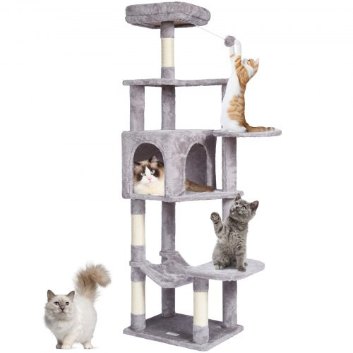 VEVOR macskafa beltéri macskáknak, 60,6"-os macskatorony macskaházzal, szizál kaparófával, függőágy, ülőrudakkal, ugróplatformokkal, nagy macskáknak való bútoros aktivitásközpont akasztólabdával, világosszürke