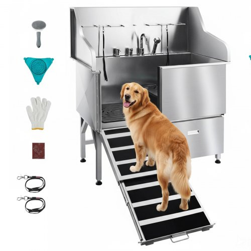 VEVOR 304 rozsdamentes acél kutyamosó állomás, 127 cm-es kisállatkozmetikai kád csúszásgátló, alacsony lejtésű rámpával, tárolófiókkal, meleg és hideg csapteleppel, többfunkciós kád kutyakozmetikai üzletbe, minden mérethez illik (